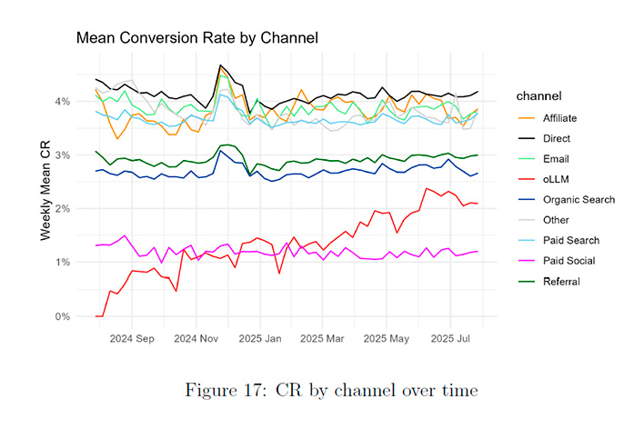 The researchers demonstrate that LLMs generate more purchases than social media advertisements. However, search engines still achieve higher conversion rates (CR) and average revenue per session. Nevertheless, the study's authors do observe learning effects: the conversion disadvantage is likely to diminish further in the coming months.