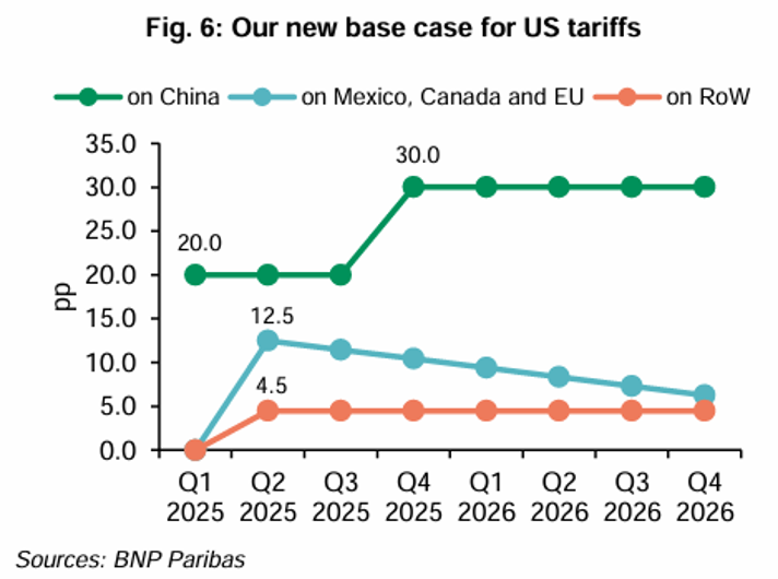 The European Union is charged a rate of 20%. BNP Paribas 360 in London expects the additional import tariff to be reduced to 12.5 per cent after negotiations. The direct and indirect impact would lower Eurozone GDP levels by 0.7 percentage points in 4Q26. This year, 0.4 per cent of the growth will be pinched off and 0.3 per cent next year. This brings the expected growth to 1.3 per cent and 1.5 per cent, thanks to the positive effect of the German 500 billion euro in public investment for the next 12 years and huge defence spending across Europe. The ECB’s cut in interest rates has also boosted lending in recent months. Is this beautiful growth written in the stars? Definitely not. If Trump sticks to his guns, the chances are high that the US will suffer a recession. Traditionally, the European Union has therefore had the same fate. At that time, the ECB could cut its interest rates even further than the 2% we have so far pushed forward. But maybe those old rules no longer apply in this New World Economy?
