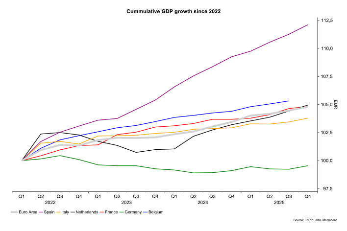 In retrospect, the Belgian economy has performed relatively strongly compared to most other European stalwarts. In fact, since 2022, when the ECB commenced its hiking cycle, Belgian growth has outpaced that of neighbouring countries France, Germany and the Netherlands. Notwithstanding the Spanish boom, the Belgian economy grew faster than the Euro Area as a whole.