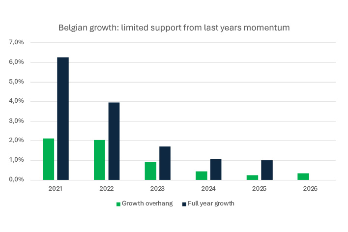 * The typical boost of “growth overhang” is likely to be only 0.3% this year, assuming the NBB’s Q4 flash estimate is accurate. A quick reminder: growth overhang provides a baseline for next year’s economic growth, assuming GDP remains unchanged throughout the year. Essentially, it shows us what annual growth would be like if all four quarters equalled last year’s Q4. In the wake of the pandemic, significant quarter-on-quarter improvements helped fuel our expectations for subsequent annual growth. However, as the graph below shows, this effect has been declining in magnitude for a while now.