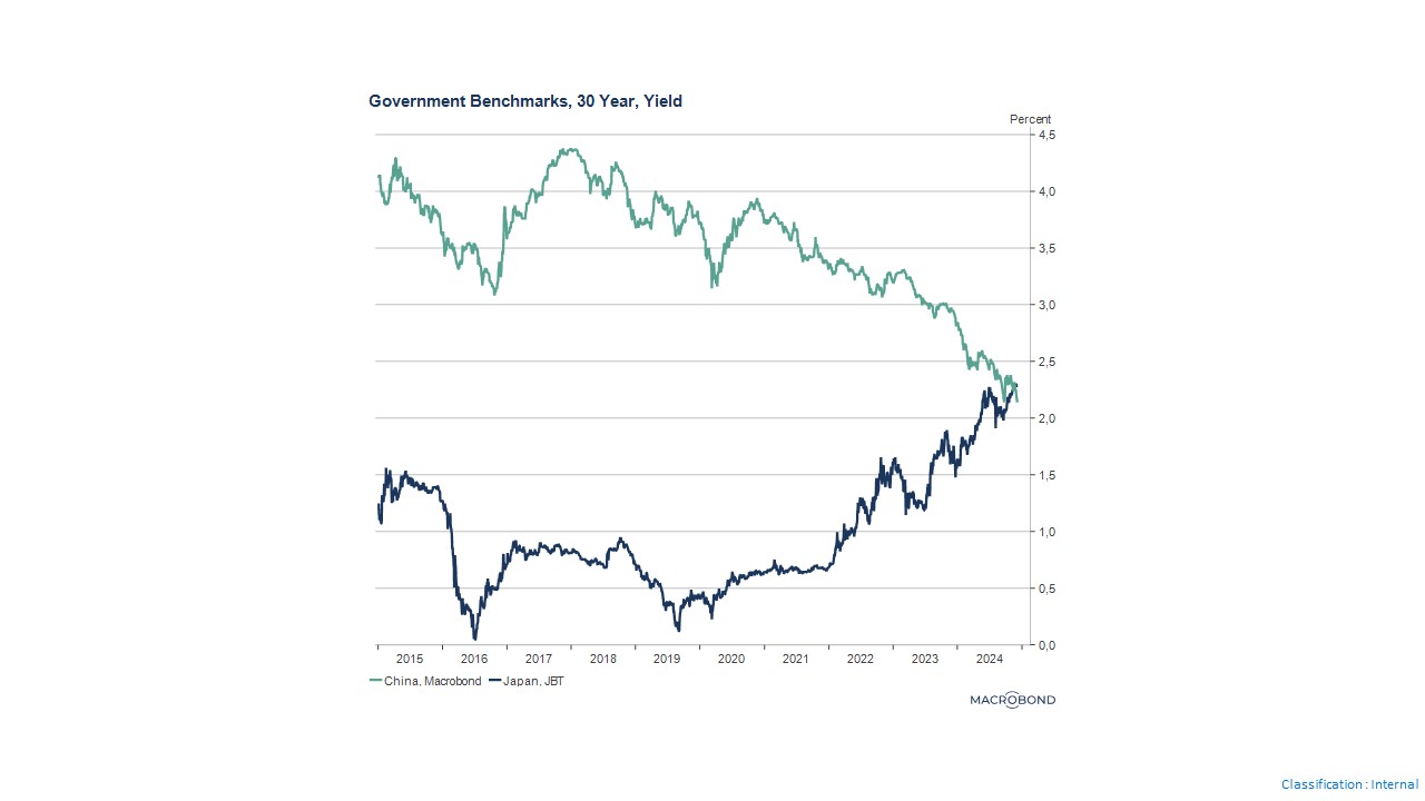 China's monetary policy is likely to remain accommodative for the foreseeable future, despite temporary boosts to yields from measures aimed at stimulating the property and stock markets. The country is keen to avoid following in Japan's footsteps, which experienced a period of stagnation in the 1990s. To prevent a similar fate, China has been investing heavily in high-tech sectors, green energy, and electric vehicles to drive long-term growth. Some Chinese policymakers view low long-term interest rates as a sign of expected weakness in domestic growth and inflation, and are taking all possible measures to counter this pessimism.