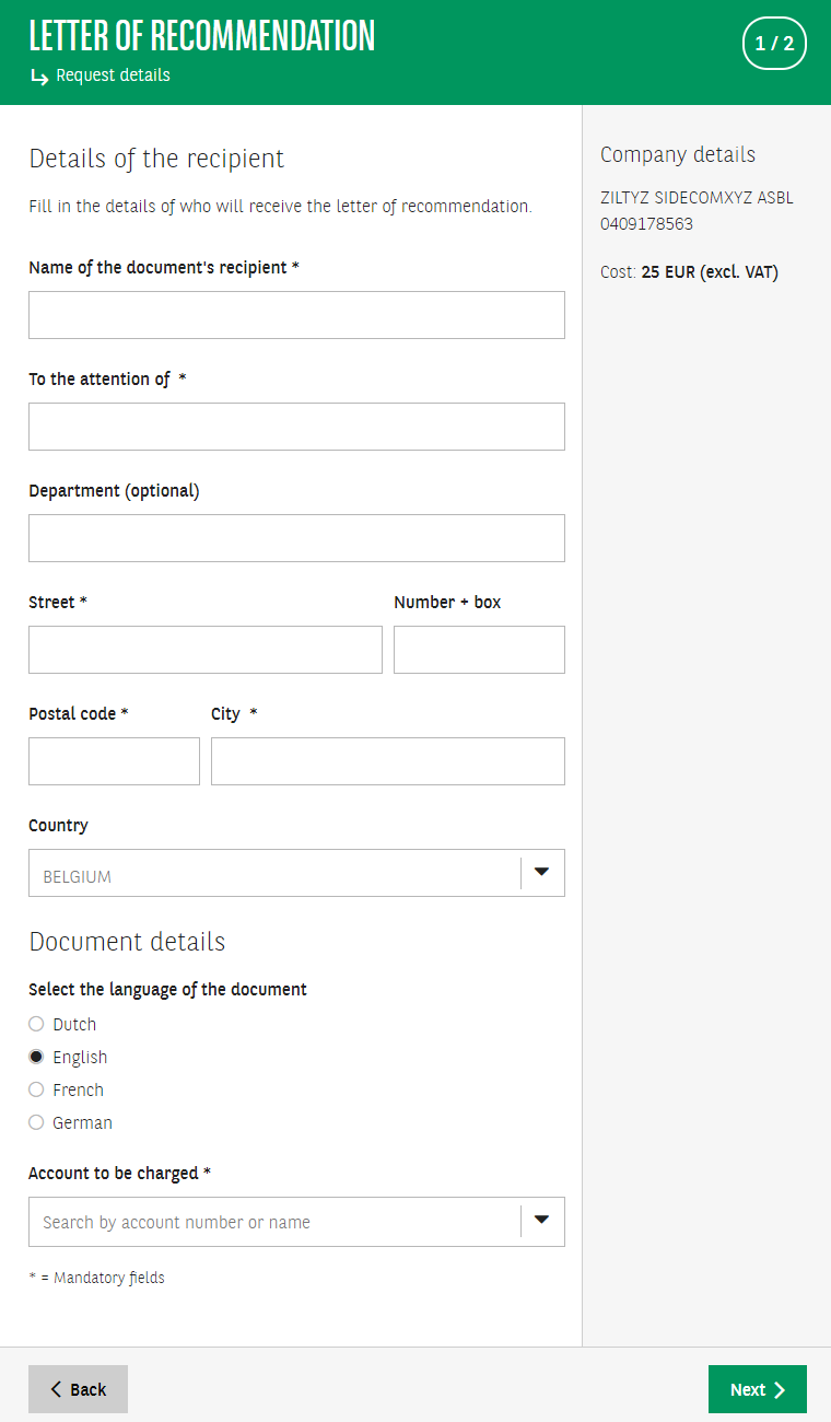 3. Fill out the details of the document's recipient. Choose the language and the account to be charged. Click on Next.