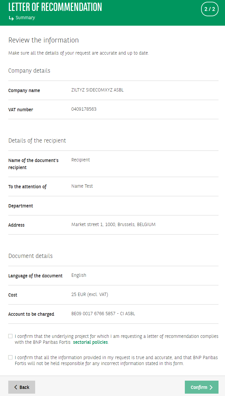 The letter of recommendation, a document issued by the Bank, describes the quality of the Bank's relationship with you as its client. It is immediately available via Easy Banking Business. The request costs 25 EUR. Your request will be checked by the bank. If you require a letter with a customized content, please contact your branch or relationship manager. If you need a recommendation in the context of a Belgian public tender, please request a bank declaration.