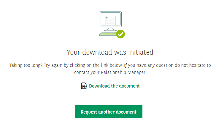 5. The document is downloaded from your browser and is saved on your computer in the default location for downloads. If necessary, click on Download the document. Click Request another document to request another document or on Easy Banking Business to leave Request documents.