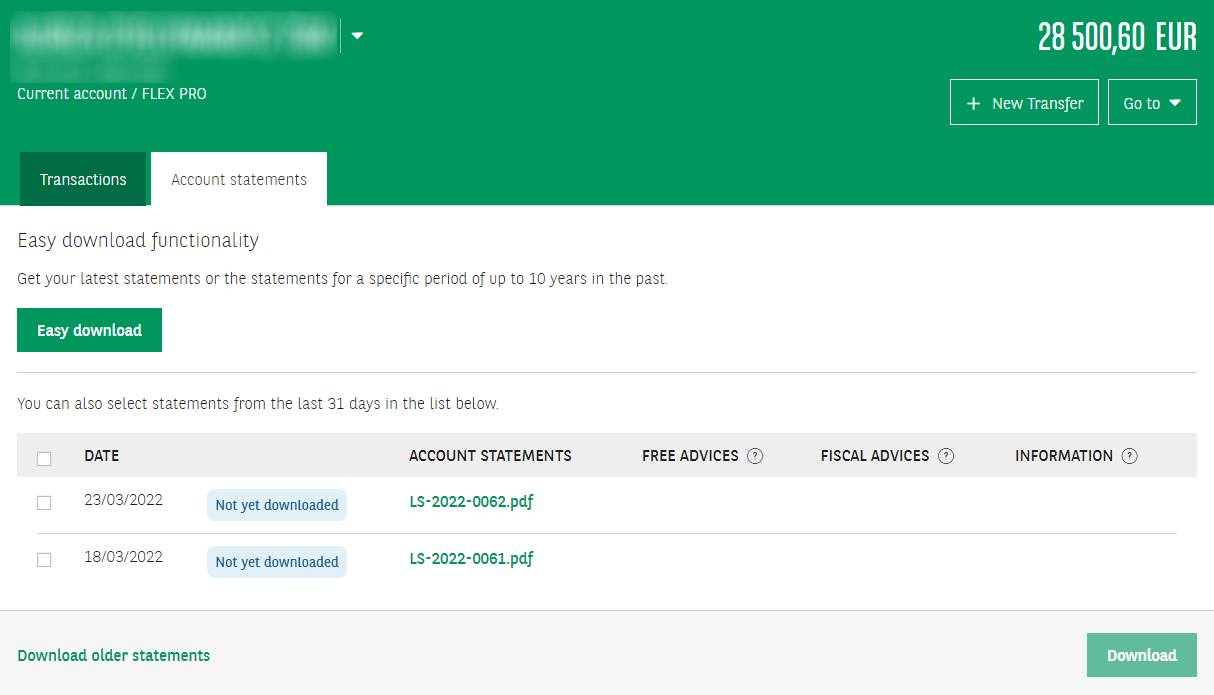 4. Click on Account statements. You will see the latest account statements. You can select them and click on Download or open them by clicking on the name of the statement. If you are looking for other statements, click on Easy download or on Download older statements.