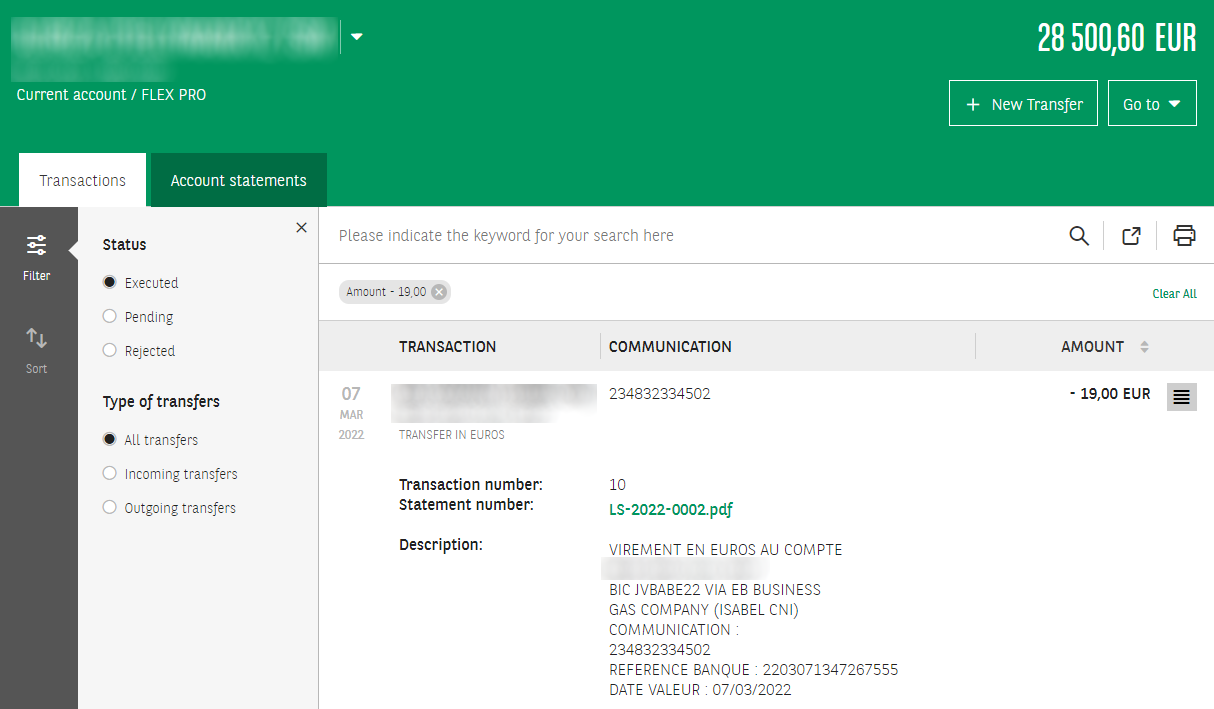 5. Click on the transaction to see more details and click on statement number to open the statement linked to the transaction. The file is downloaded in your Internet browser.