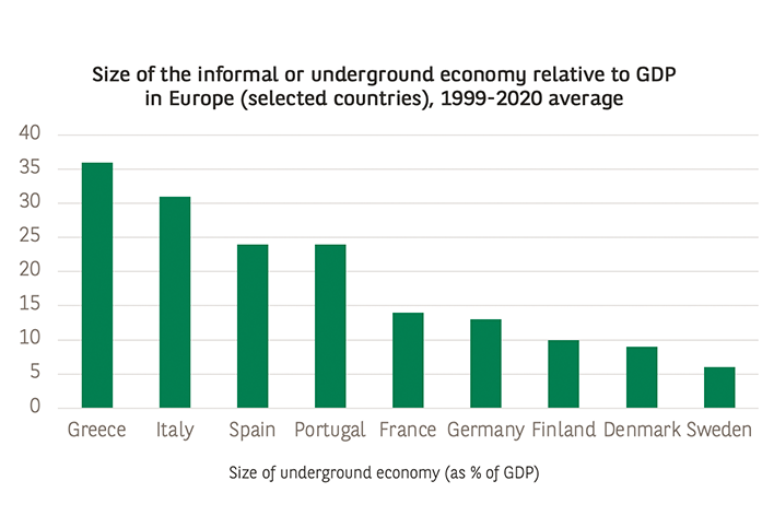 En 2021, la Banque mondiale a estimé l’ampleur de l’économie souterraine à 17% du PIB dans les pays développés et à 32% dans les pays émergents. En Europe, selon Rogoff, elle varie de 6% en Suède à 36% en Grèce. Pas négligeable, donc.