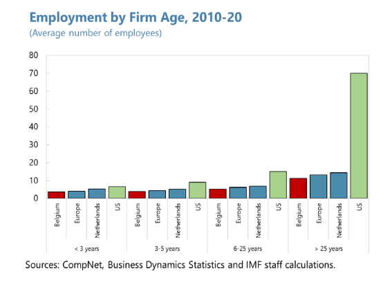 C’est vrai pour l’ensemble de la population. Le graphique ci-dessous montre l’emploi moyen par pays pour les entreprises de différentes tranches d’âge. Outre le succès des États-Unis dans chaque catégorie, il est frappant de constater que la Belgique obtient toujours un score inférieur aux Pays-Bas et à la moyenne européenne.