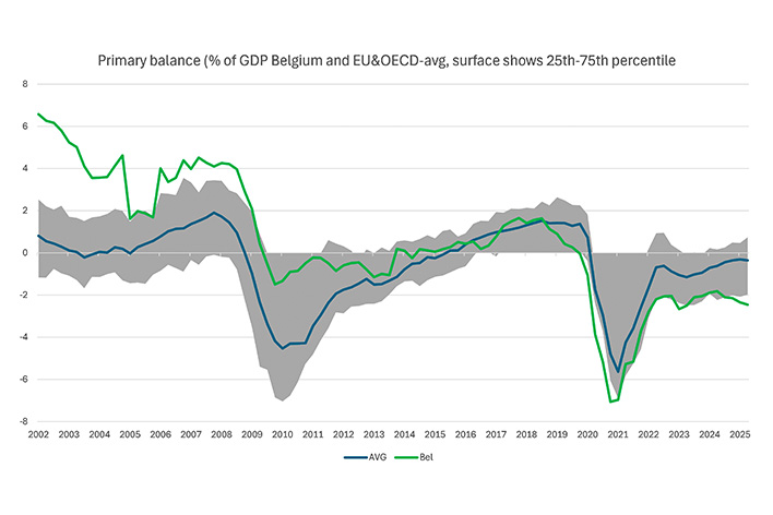 Au tournant du siècle, le bilan primaire de la Belgique était bon. Il était même bien plus positif que celui de la plupart des pays qui appartiennent actuellement à la fois à l’UE et à l’OCDE. Le graphique ci-dessous montre comment la Grande Crise Financière et surtout la pandémie de Covid ont perturbé l’ordre de choses, et pas seulement pour la Belgique.