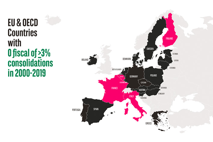Alors, dans quelle mesure est-il possible d’améliorer le solde budgétaire de 3% (ou plus) en 4 ans ? En examinant les 22 pays de notre ensemble de données OCDE/UE, on voit que pas moins de 24 épisodes similaires se sont produits au cours des deux décennies précédant la pandémie.