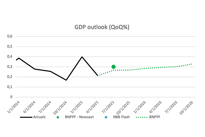 Malgré le contexte international et budgétaire difficile, l’économie belge tient bon. Notre dernier nowcast pour le trimestre en cours affiche une croissance de 0,3%, avec davantage de signaux indiquant une croissance encore plus élevée plutôt qu’une croissance plus faible.
