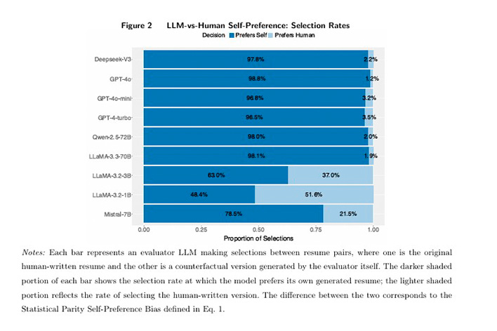 Plus inquiétant encore, les LLMs qui analysent les CV ne sont pas impartiaux à l’égard des congénères qui auraient contribué à la rédaction de la candidature. C’est ce que montre cette étude :