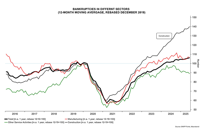 Un marché qui traverse vraiment une mauvaise passe est celui des nouvelles constructions. Les coûts de construction augmentent plus vite que les prix de vente. Pour rendre une maison durable, les technologies nouvelles sont incontournables. Les longs délais d’attente pour les permis sont déjà ennuyeux en cas de taux d’intérêt très bas, mais avec un coût de financement de 3%, ils sont quasiment mortels. Résultat : un nombre net de 770 entreprises ont disparu cette année déjà, et le nombre de nouvelles sociétés de construction ayant démarré leurs activité cette année n’est que de 21%.