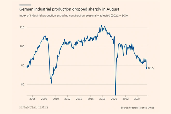 Les chiffres du PIB du troisième trimestre publiés ce jeudi confirment que l'économie allemande reste atone. Après avoir diminué au cours des deux dernières années, le FMI s'attend d’ailleurs à ce que le pays affiche une croissance de 0,2 % cette année, le taux le plus lent parmi les grandes économies avancées. Le chômage a légèrement augmenté depuis janvier pour atteindre près de 3 millions de demandeurs d’emploi, son plus haut niveau en 14 ans. La production industrielle a fortement chuté en août. A cet égard, un graphique publié dans le Financial Times a retenu toute notre attention. On y constate que la production industrielle allemande est tombée en-dessous de son niveau de 2006 ! Il y a de quoi s’inquiéter.