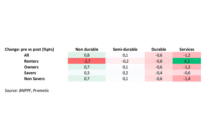 De manière générale, nous constatons que le départ à la retraite va de pair avec une diminution des dépenses en biens de consommation durables tels que l’électroménager et les voitures. Dans le même temps, une part croissante du budget du ménage est allouée aux biens non durables, comme les produits alimentaires, ainsi qu'aux biens dits semi-durables (achats récurrents mais non fréquents) tels que les chaussures et les vêtements.