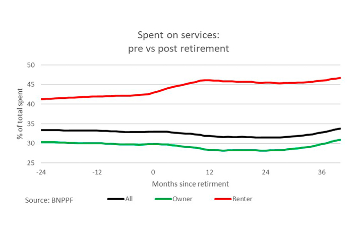 Les différences dans les dynamiques de dépenses sont encore plus frappantes lorsque l’on compare les propriétaires et les locataires. Ces derniers voient en effet leurs dépenses de services (y compris leur loyer) augmenter significativement. Lorsqu’ils prennent leur retraite, leurs revenus mensuels, qui constituent le dénominateur dans le ratio utilisé ici, chutent de manière plus prononcée. En conséquence, la part totale des services (y compris le loyer) augmente, même lorsque les dépenses totales demeurent stables. Néanmoins, au cours des dernières années, nous constatons que la part de ces services augmente également pour l’ensemble de la population.