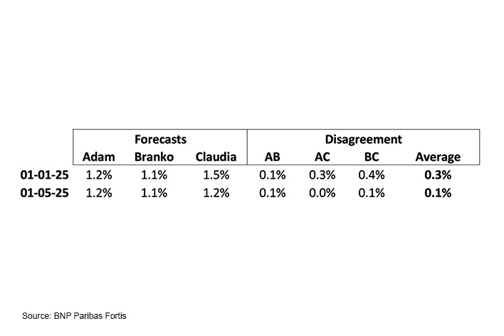 Adam (1,2 %) et Branko (1,1 %) commencent l'année en étroite convergence. Claudia a une estimation de croissance plus élevée en tête. La colonne « AB » montre la différence absolue entre les prévisions faites par Adam et Branko, qui en janvier est inférieure à celle entre l'un d'eux et Claudia. Le résultat est une différence absolue moyenne de 0,3 %.