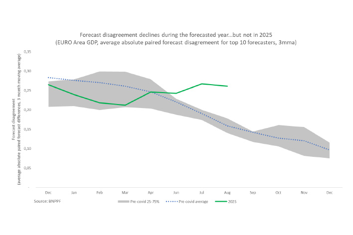 Finalement, le désaccord sur la croissance de 2025 diminuera lorsque les chiffres du troisième et du quatrième trimestre seront publiés. Cependant, nous constatons déjà un désaccord significatif sur les perspectives de croissance pour 2026. L'ère de la prévision de PIB unique et large semble être révolue, du moins pour le moment.