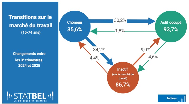 Malgré ce refroidissement du marché du travail, l’ambition du gouvernement De Wever est de remettre davantage de personnes au travail. À cet égard, l’analyse trimestrielle de la transition de Statbel laisse entrevoir des signes d’espoir.