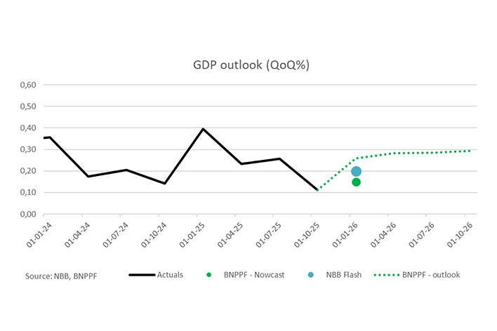 Il est clair que le taux de chômage, tout comme l’inflation, reste à un niveau relativement bas. De plus, le marché immobilier semble retrouver son élan, après plusieurs trimestres de frilosité des acheteurs potentiels face à la hausse des taux d’intérêt. La publication des comptes nationaux pour 2025 démontre à nouveau que les ménages restent le moteur de l’économie belge. La croissance totale du PIB atteint 1,0%, dont pas moins de 0,9 point de pourcentage provient de la consommation privée*.