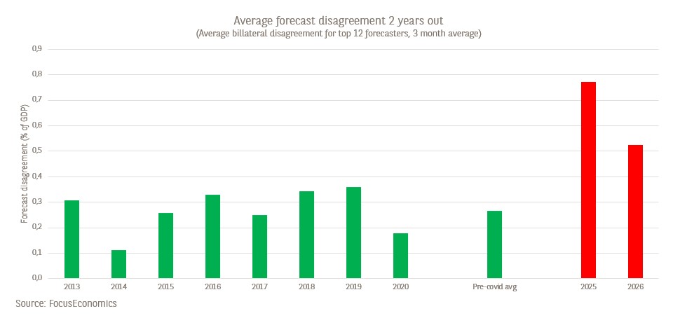 Une analyse basée sur les chiffres de l’agrégateur prévisionnel Focus-Economics montre à quel point ce désaccord est aujourd’hui important pour la croissance belge. Le graphique ci-dessous illustre la différence moyenne entre les prévisions présentées par les différents membres du panel, comme les banques et les groupes de réflexion, pour les années mentionnées sur l’axe horizontal.