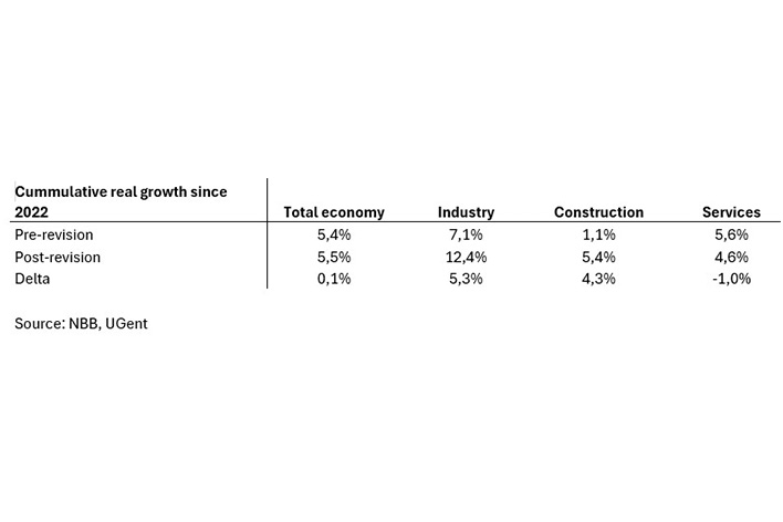Nous constatons le phénomène inverse dans le secteur des services, responsables de plus de la moitié de toute la valeur ajoutée de notre pays. La croissance plus lente que prévu compense les chiffres révisés tant pour la construction que pour l’industrie. Dans l’ensemble, notre économie a grandi à peu près au même rythme en termes réels dans la nouvelle série de données que dans l’ancienne.