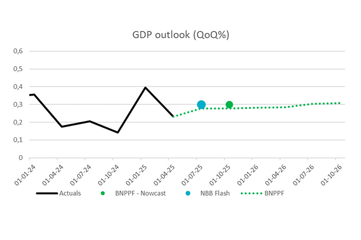 En pleine consolidation fiscale, une légère accélération de la croissance serait la bienvenue pour le gouvernement De Wever. Nous ne le voyons pas pour l’instant, mais une révision récente des chiffres du PIB fait à nouveau baisser légèrement le ratio de la dette. Notre premier nowcast pour le quatrième trimestre en cours confirme la croissance stable des derniers mois. Avec un mois de retard, nous estimons une croissance trimestrielle de 0,3% en collaboration avec l’Université de Gand. C’est aussi élevé que l’estimation éclair publiée par la Banque nationale fin octobre pour le troisième trimestre.