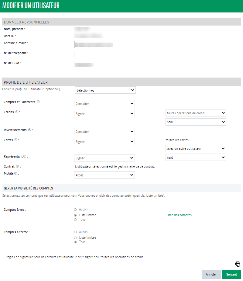 4. Compléter vos données personnelles et les droits par profil d'utilisateur. Vérifiez votre demande et signez-la. Dès que les signatures nécessaires ont été apposées, la modification est effective après déconnexion.