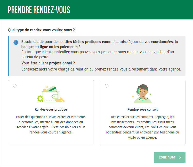 - Rendez-vous sur cette page afin de suivre les étapes pour la prise de rendez-vous. Commencez par sélectionner le type de rendez-vous que vous souhaitez prendre : un rendez-vous pratique (pour poser des questions sur vos cartes, mettre à jour vos données, accéder à un coffre,…) ou un rendez-vous conseil (pour obtenir des conseils sur les comptes, l’épargne, les assurances, etc.). Cliquez ensuite sur Continuer.
