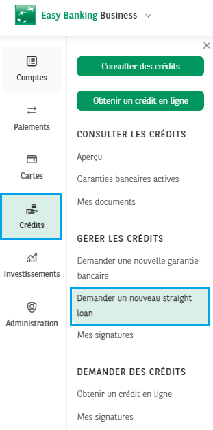 - Dans le menu du module Crédits, cliquez sur Demander un nouveau straight loan pour ouvrir le module straight loans. Ou cliquez sur la tâche que vous avez reçue.