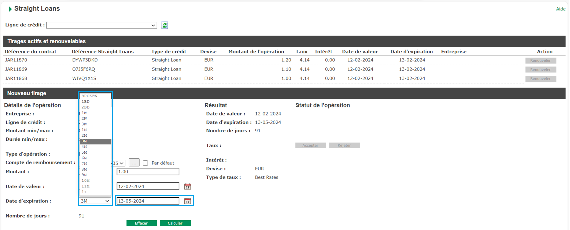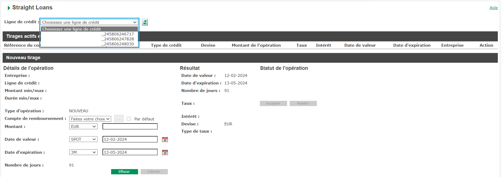 6. Cliquez sur Calculer pour obtenir une proposition, veuillez noter que dans certains cas, il n'y a pas de proposition possible avant 11 heures. Ce bouton n'est disponible que s'il existe un montant et une date valides. Ensuite, dans les 60 secondes, cliquez sur Accepter pour accepter l'offre et finaliser le tirage, ou cliquez sur Rejeter pour refuser l'offre.