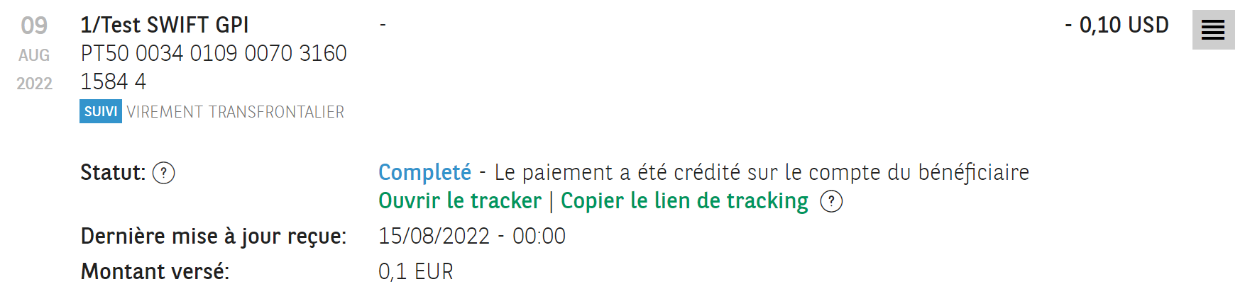 - Transparence : vous disposez à tout moment du statut le plus récent, basé sur les informations que BNP Paribas Fortis reçoit de SWIFT.