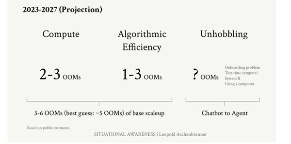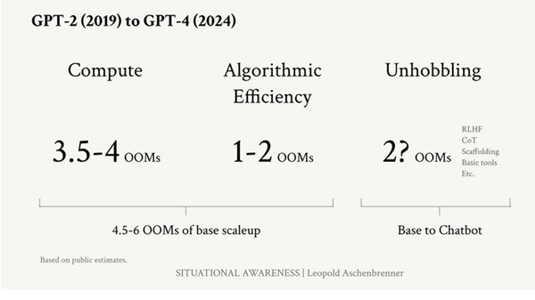 - Toename in rekenkracht van 3 à 4 grootteordes, wat Aschenbrenner ‘OOMs’ (Orders of Magnitude) noemt