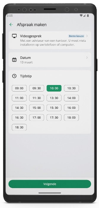 4. Tik op 'Afspraak maken' en selecteer de optie die het beste bij u past: videogesprek, telefoongesprek of face-to-face.