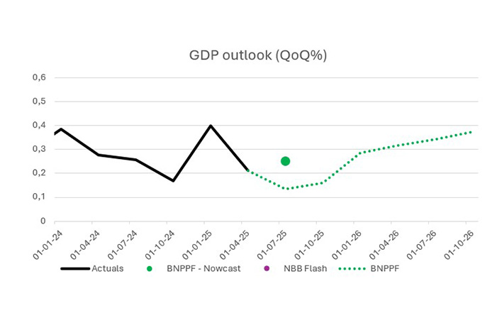 De eerste update van onze maandelijkse nowcast wijst op een groeicijfer van 0,25%. Dat is onder het langetermijngemiddelde, maar boven wat het vertragende 2e kwartaal liet optekenen. Hoe interpreteren we dit datapunt het best?