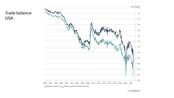 Het enorme handelstekort van de VS was vanaf het begin een thema in de verkiezingscampagne. En al in de eerste uren van de ambtstermijn 2.0 van Trump kwam de aankondiging van invoerheffingen tegenover China, Mexico en Canada. Sindsdien ontstond er een soort koehandel, zoals lagere heffingen in ruil voor een betere grensbewaking. Maar niet voor producten uit China. Het moet gezegd dat de recente publicatie van de cijfers over 2024 de Amerikaanse president wellicht heeft gesterkt in zijn plannen. Het exploderende Amerikaanse handelstekort (in goederen en diensten) steeg in 2024 met 17% tegenover het jaar daarvoor. Het handelstekort bereikte daarmee 918 miljard dollar. Het slechtste resultaat ooit, met uitzondering van 2022. De explosieve stijging van het tekort in de laatste maanden van het jaar is deels te wijten aan het feit dat Amerikaanse bedrijven op de douanetarieven wilden anticiperen. Daarom importeerden ze, nog voor de invoering ervan, meer dan nodig was. Alleen al in december liep het tekort in de handel in goederen op tot 122 miljard dollar, waardoor het totale jaardeficit een historisch record van 1.211 miljard dollar bereikte. Vergeleken met oktober (vóór de overwinning van Donald Trump) groeide het tekort dus met 24%. Als we daarvan de olietransacties, die in 2024 een overschot van 44 miljard dollar boekten, zouden aftrekken, betekent dat dat de Amerikaanse handelsbalans in 2024 een gat van bijna 1.250 miljard dollar vertoonde!