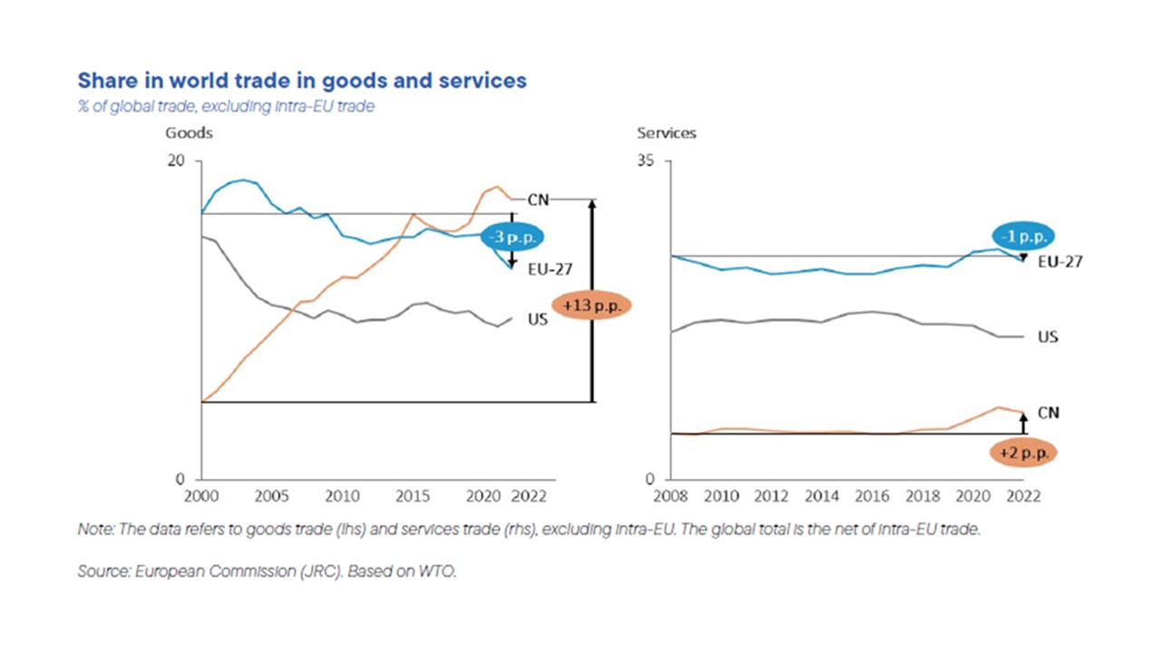 Ces différences se traduisent par des besoins d’investissements beaucoup plus importants pour les entreprises européennes à court terme. Pour les quatre industries les plus gourmandes en énergie – substances chimiques, métaux de base, minéraux non métalliques et papier – le coût de la décarbonation dans les 15 prochaines années se montera à environ 500 milliards d’euros. Pour les sous-secteurs du secteur du transport qui sont les plus difficiles à décarboner (navigation et transport aérien), les besoins d'investissements s’élèvent à environ 100 milliards d’euros par an pour la période de 2031 à 2050. Résultat ? La compétitivité européenne a fortement reculé depuis 2022 dans ces secteurs, ce qui se traduit par une réduction de la part d’exportation de l’UE dans le monde.