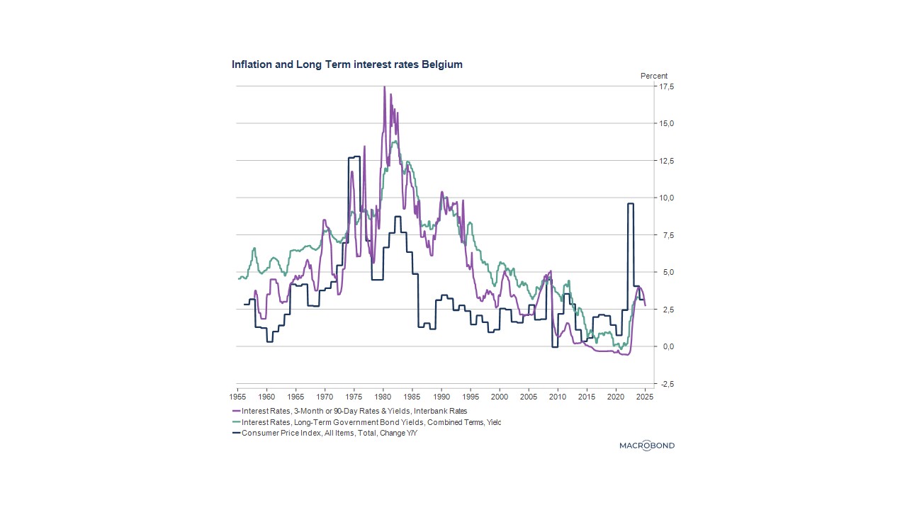 Het waarschijnlijkste gevolg van die situatie van overvloedige liquiditeiten is ongetwijfeld dat de waarde van geld wat verzwakt … en dat betekent lagere rentetarieven. Als we naar het absolute niveau van de rente kijken op het ergste moment van de inflatiepiek in 2023 en die vergelijken met de situatie tijdens de vorige inflatieschokken (1973 en 1979), moeten we vaststellen dat zowel de korte als de lange rente, een stuk lager is gebleven. Toegegeven, na verschillende jaren met rentevoeten dicht bij nul lijkt het huidige niveau misschien hoog. Vooral voor wie de jaren van de eerste olieschokken niet heeft meegemaakt. Maar een historische vergelijking toont duidelijk het verschil. Toen de inflatie in de jaren 70 en 80 tussen 8 en 12% bedroeg, schommelden de rentetarieven tussen 12 en 15%. Tegenover een rente van nauwelijks 4% tijdens de recente energieschok die de oorlog in Oekraïne had teweeggebracht. Toch leidde die tot een inflatie vergelijkbaar met die van de jaren 70 en 80.