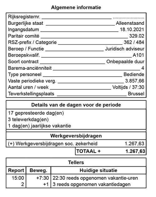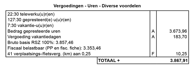 Overzicht van de gepresteerde dagen (of uren) in de betrokken periode, het aantal feestdagen, het aantal betaalde vakantiedagen, het aantal (al dan niet betaalde) dagen afwezigheid wegens ziekte. Als je dat allemaal optelt, krijg je het brutobasisloon.