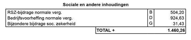 De RSZ-bijdragen: van het totale brutoloon van een bediende wordt een bijdrage van 13,07% ingehouden. Voor arbeiders wordt de bijdrage berekend op basis van 108% van het brutoloon (bron: Securex). Die sociale bijdragen vloeien naar het systeem van pensioenen, gezondheidszorg, werkloosheidsuitkeringen enz. en je bouwt er je sociale rechten mee op.