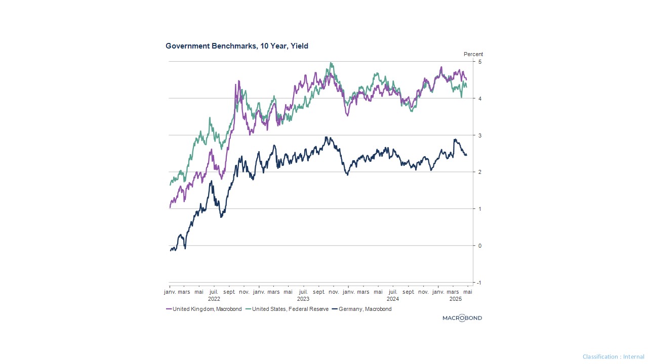 Beleggers zijn dus massaal uit de Amerikaanse markt gestapt en hebben zich geherpositioneerd op …. Duitsland. Het Duitse beheer van de overheidsfinanciën blijft een schoolvoorbeeld, zelfs wanneer het land besluit om massaal geld uit te geven om zijn concurrentievermogen te verbeteren en zich te herbewapenen. Deze keuze van de beleggers leidde in Europa tot een zekere versoepeling van de langetermijnrente. Dat is voordelig voor lidstaten met een vaak veel te hoge schuldenlast waardoor ze een stijging van de kosten van die schuld moeilijk kunnen dragen. Deze ontwikkeling is weliswaar onverwacht, maar bijzonder welgekomen. Waaruit nog maar eens blijkt dat de ene zijn dood de ander zijn brood is.