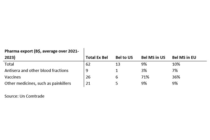 Onderstaande tabel verduidelijkt de relevante cijfers voor de totale Belgische farma-export (gemiddelde over de periode 2021-2023) voor zowel het totaal als de drie voornaamste exportcategorieën naar de VS. Die drie zijn tegelijk ook verantwoordelijk voor 90% van onze totale wereldwijde medicijnuitvoer.