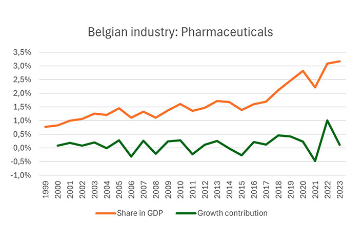 Onderstaande grafiek toont (oranje) het toenemend aandeel van de farmasector in ons totaal BBP. Daarnaast valt ook op (groen) dat de sector in 2022 goed was voor 1 procentpunt van de totale BBP-groei.