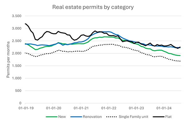 Hoe staat het met de Belgische huizenmarkt? De klimaattransitie blijft een grote uitdaging, terwijl de monetaire versoepeling net zuurstof geeft. In dit artikel bespreken we aan de hand van vijf 5 grafieken de recentste evoluties. Bouw- en renovatie vergunningen stagneren, de woonkredietproductie is stabiel en appartementen liggen goed in de markt. Toch dragen gezinsinvesteringen steeds minder bij aan de BBPbbp-groei. Desondanks apprecieert het Belgisch vastgoed verder.