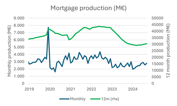 Afgezien van de woonbonuspiek eind 2019 en eerder ook eind 2014 ligt de maandelijkse hypothecaire kredietproductie in ons land in het recente verleden tussen de 2 en 4 miljard volgens de cijfers van de kredietenfederatie. Maar in die cijfers zitten aanzienlijke seizoenseffecten. Interessanter is het daarom om naar de 12-maands voortschrijdende productie te kijken. Die piekte over heel 2022 met ruim 43 miljard. Een jaar later was dat nog slechts 30 miljard en ook dit jaar lijkt de totale productie daar niet ver bovenuit te zullen komen.