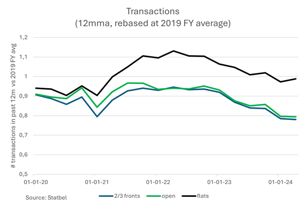 In 2023 lag het aantal vastgoedtransacties een stuk lager dan de voorgaande jaren. Ook in de eerste helft van dit jaar blijven de transacties achter op dat niveau. Behalve dan voor appartementen. Die worden een stuk vlotter verhandeld dan gesloten en (half)open bebouwingen. Er werden begin dit jaar omgerekend 20% minder huizen verkocht op de secundaire markt dan voor de coronapandemie nog het geval was.