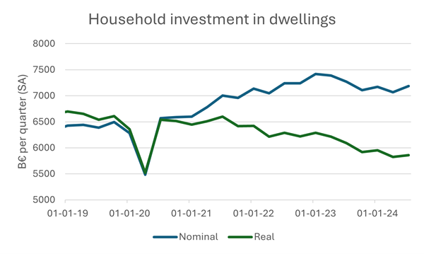 Gezinnen die woningen kopen, dragen bij aan het bruto binnenlands product (bbp). Dat doen ook de bedrijven en de overheid, wanneer ze investeren. Investeringen vormen zowat een kwart van ons totale bbp. Binnen die groep zijn bedrijven verantwoordelijk voor bijna twee derde. Het aandeel van gezinsinvesteringen in het bbp zit momenteel rond de 5%. Een positieve groei-bijdrage levert dat echter niet op. In volume of reële termen liggen die investeringen ruim 12% lager dan hun piek in 2021.