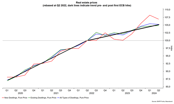 Historisch vertoont de Belgische vastgoedmarkt een erg stabiel prijsverloop. In nominale termen was er de afgelopen halve eeuw steeds 3-4% groei per jaar. De blauwe lijn op de onderstaande grafiek toont hoe die evolutie zelfs nog licht versnelde in de covidjaren. Het valt ook op hoe de prijs van nieuwbouwwoningen wat volatieler is, maar niet sneller toeneemt dan wat betaald wordt op de secundaire markt. Sinds de Europese Centrale Bank (ECB) haar rentevoeten een eerste maal optrok in de zomer van 2022 was er vrees voor vertraging, zeker in de buurlanden, maar bij ons veel minder. De zwarte trendlijn loopt nadien iets minder stijl, maar ondanks de toenemende verkrapping stegen de prijzen ook de laatste 2 jaar met goed 2,5%.
