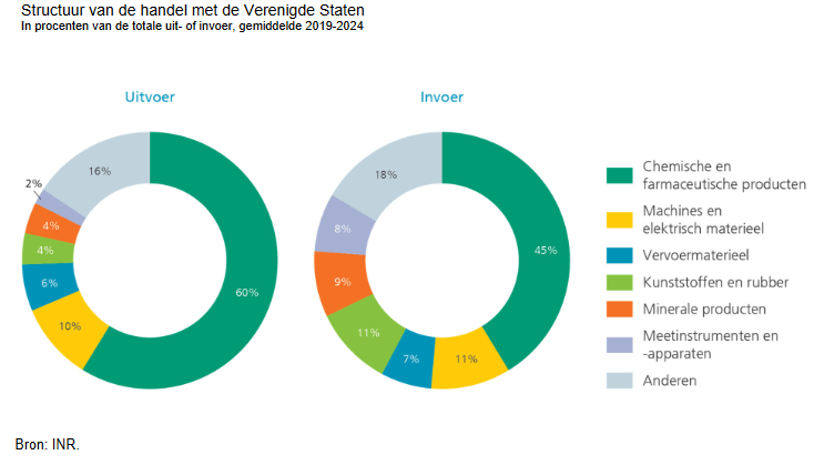 De Nationale Bank geeft aan dat de handel met de Verenigde Staten in het bijzonder gericht is op chemische en farmaproducten. Die maakten tussen 2019 en 2024 gemiddeld 45% uit van de invoer en zelfs 60% van de uitvoer, zoals te zien is op onderstaande grafiek. Dat is toe te schrijven aan de Belgische vestigingen van dochterondernemingen van grote Amerikaanse multinationals in de sector. Een eventuele heffing op die goederen hoeft niet direct een grote impact te hebben: het gaat over producten met een eerder lage prijselasticiteit. Het meest waarschijnlijke scenario is dan ook dat hun aandeel zal terugvallen naar het pre-covidpeil, maar niet noodzakelijk langdurig lager. Geen verdere verslechtering dus, maar voorlopig ziet het ernaar uit dat de internationale handel ook de komende jaren op onze groei blijft wegen.
